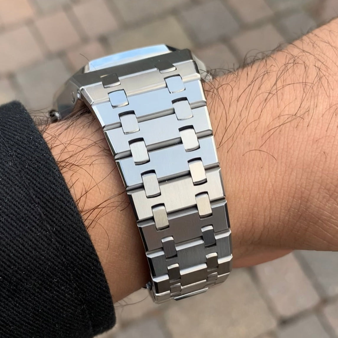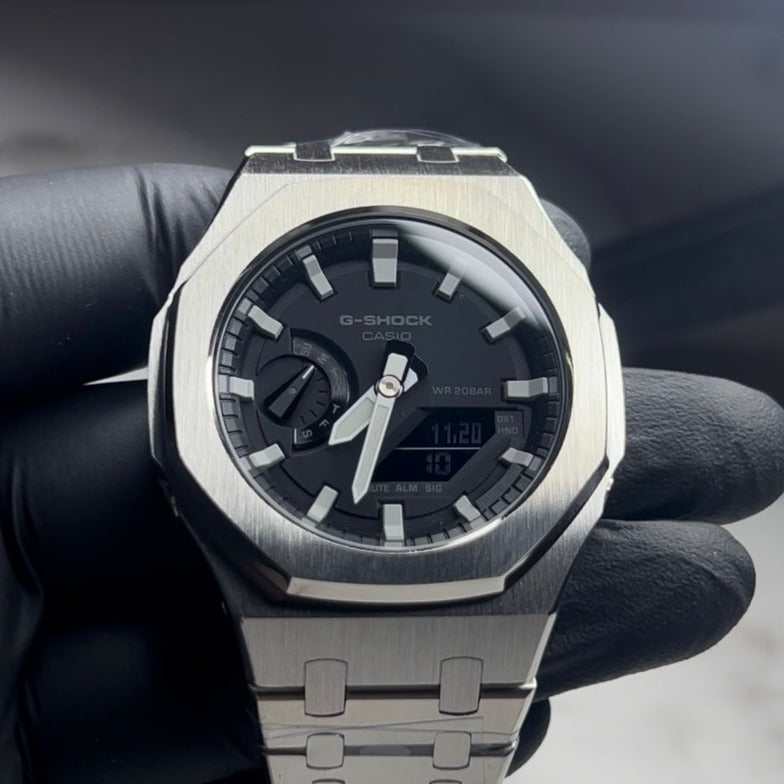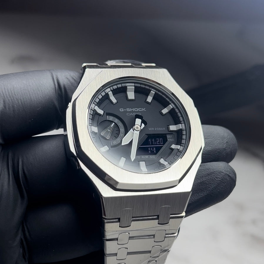 Experience our innovative 8 SIDED SILVER CASIOAK, a unique modified watch brought to you by WATCHMODS. Our expertly designed case combines comfort and elegance, crafted with advanced technical processes. The eye-catching 8 -sided bezel, perfectly matching the custom GA-2100 Aftermarket strap. Get noticed with our guaranteed standout timepiece.